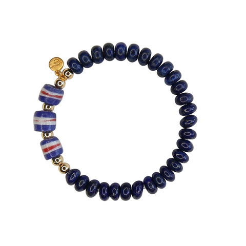 Bold, grounded, and just a little wild—the Kia Bracelet makes a statement with textured stripes. Handcrafted African beads are spaced with gleaming gold beads for a touch of movement and shine. A band of gemstones add a flash of elegant sparkle that elevates an otherwise more organic vibe. Stretch fit means it's easy to wear and even easier to give—no sizing needed. Perfect for collectors of layered color or bracelet addicts!