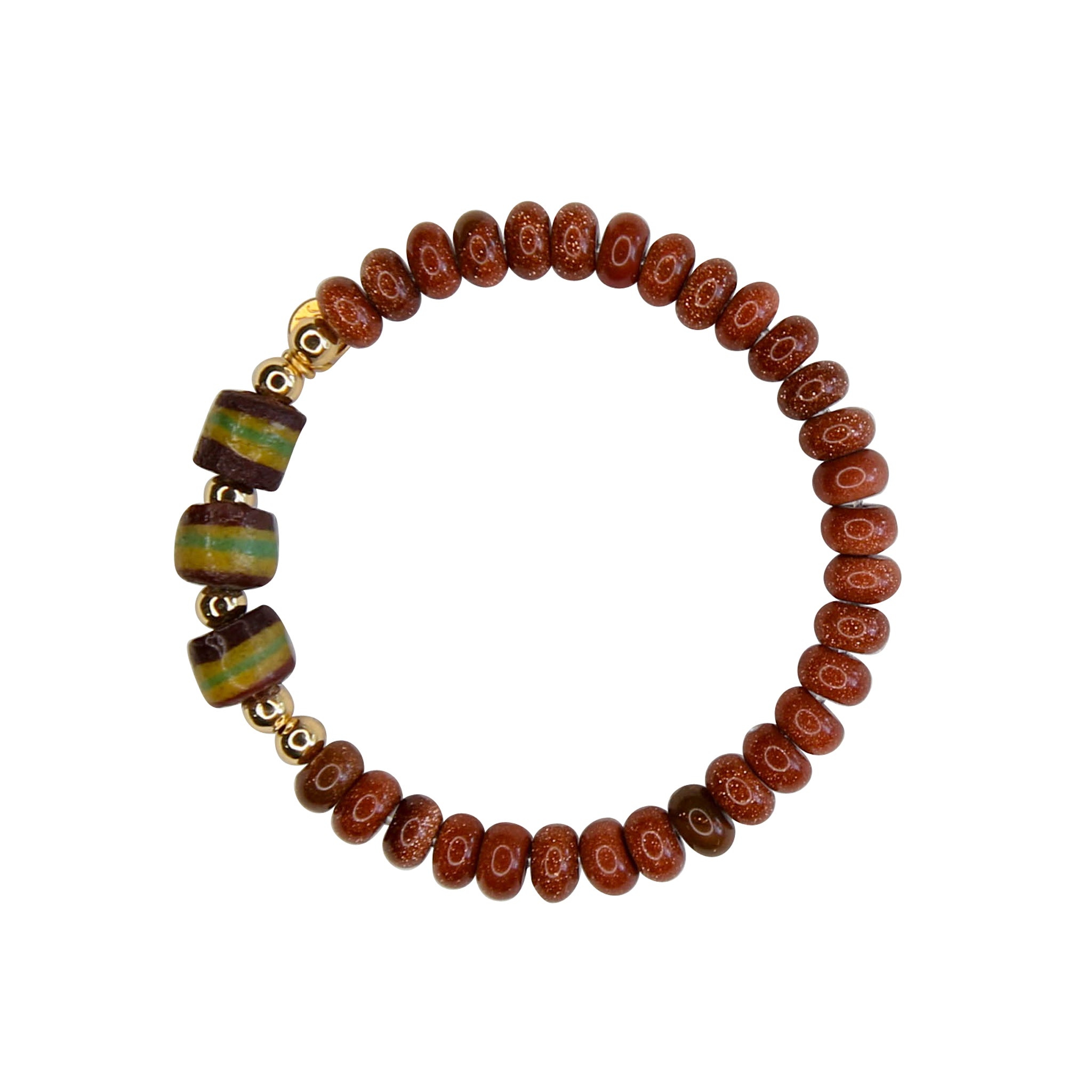 Bold, grounded, and just a little wild—the Kia Bracelet makes a statement with textured stripes. Handcrafted African beads are spaced with gleaming gold beads for a touch of movement and shine. A band of gemstones add a flash of elegant sparkle that elevates an otherwise more organic vibe. Stretch fit means it's easy to wear and even easier to give—no sizing needed. Perfect for collectors of layered color or bracelet addicts!