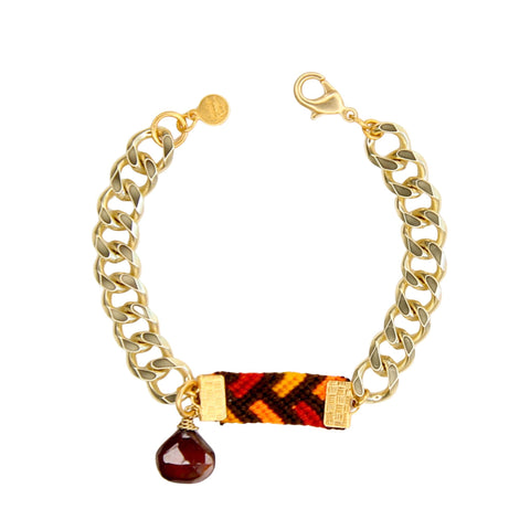 Sierra is all about contrast and connection. A bold curb chain meets a hand-woven textile bar—each one slightly unique—anchored with gleaming gold accents and a single gemstone drop that adds just a flicker of light. The result? A bracelet that feels both grounded and global, weighty and wearable in any season