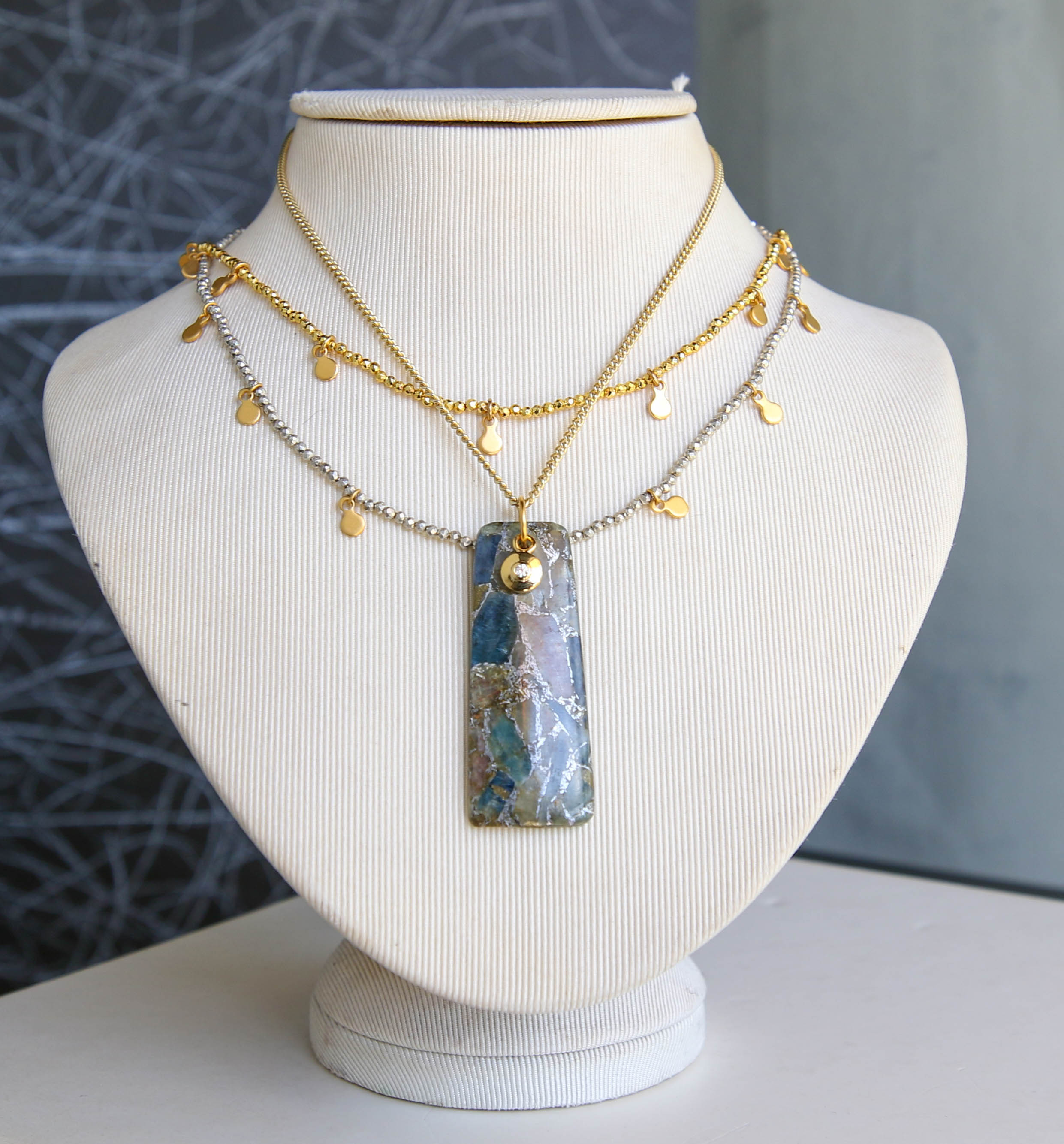 The Composite Pendant pairs the natural glow of planing various subtle stones together- kynite, bits of ruby, pyrite, granite, and finished with the tiniest CZ gold pendant. It's versatility makes it an easy everyday piece.  The single stone adds a clean, modern touch, while the silicone spacer provides complete versatility.  It’s a timeless piece that transitions seamlessly from casual to formal settings.