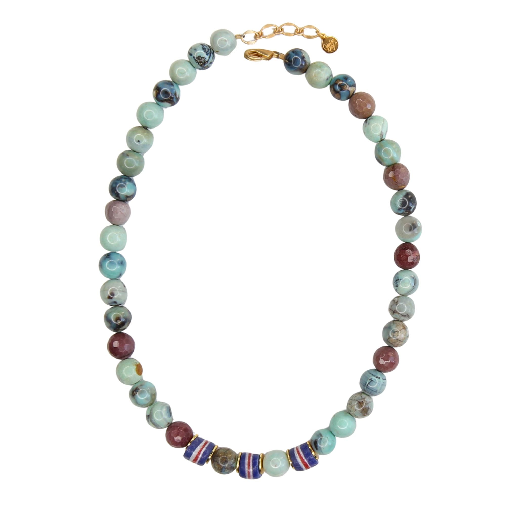 Bold yet balanced, the Sheba necklace is a staple piece with a playful edge. A dynamic mix of polished gemstones are arranged in a rhythmic pattern that feels collected, not curated. The center African beads ground the piece for a more organic feel. For the customer who loves personality, depth, and a fresh take on the season's trends.