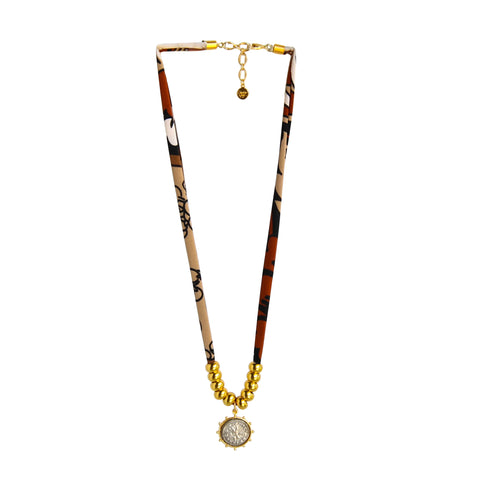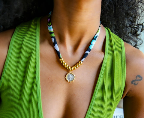 Chunky gold-plated rings are paired with a generous fabric scarf. A 2 toned coin pendant anchors the center, giving bold, playful energy without sacrificing sophistication. This piece is a standout on its own but layers easily with longer chains or casual textiles. It’s lightweight, adjustable, and guaranteed to spark conversation—whether she’s at brunch or on the go.
