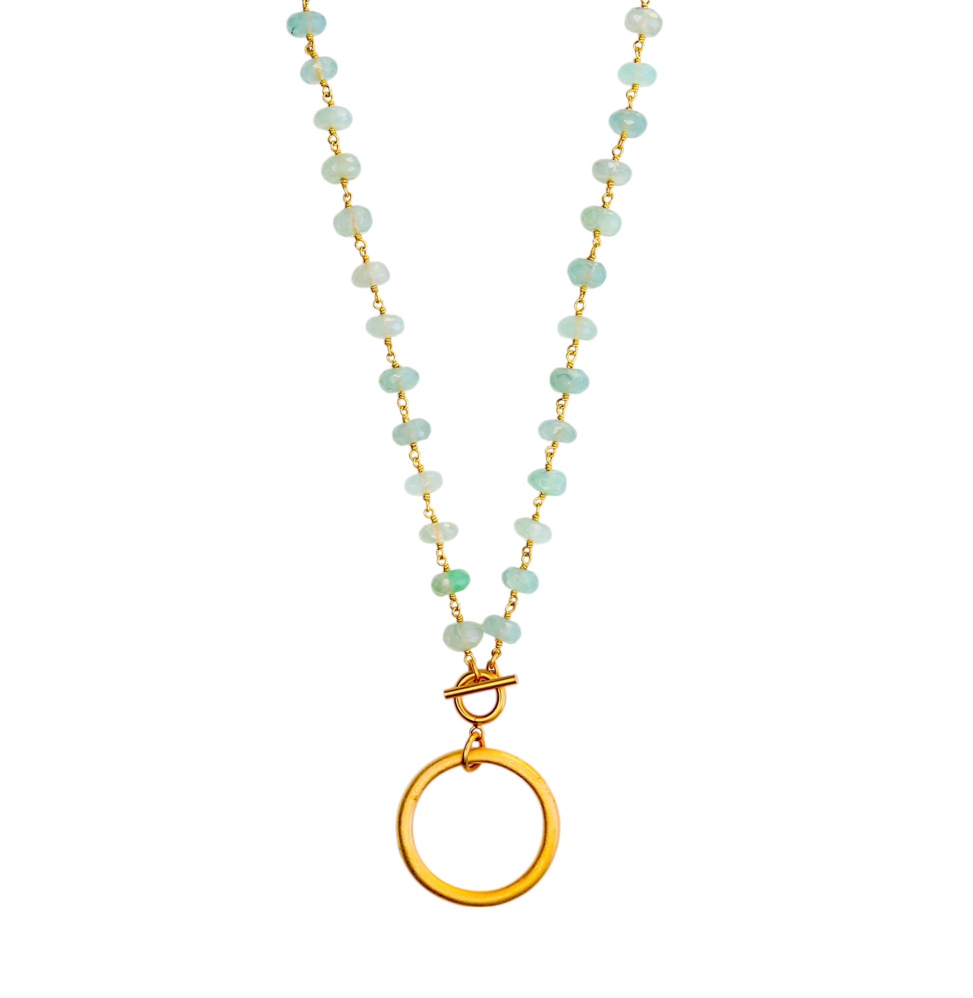 The Chunky Hoop is a modern take on a classic design, featuring a heavy gold cast hoop pendant. The necklace’s smooth aquamarine stones are spaced delicately on a gold-filled chain, creating a balanced, airy feel. The toggle clasp adds a touch of sophistication while ensuring a secure fit. We find that our retailers say our pieces are for those who like to spoil themselves. Our jewels are truly a celebration of individuality, and for those who value thoughtful details and enjoy feeling put together for any outing, from lunch, to the nail salon, to carline and everything in between.