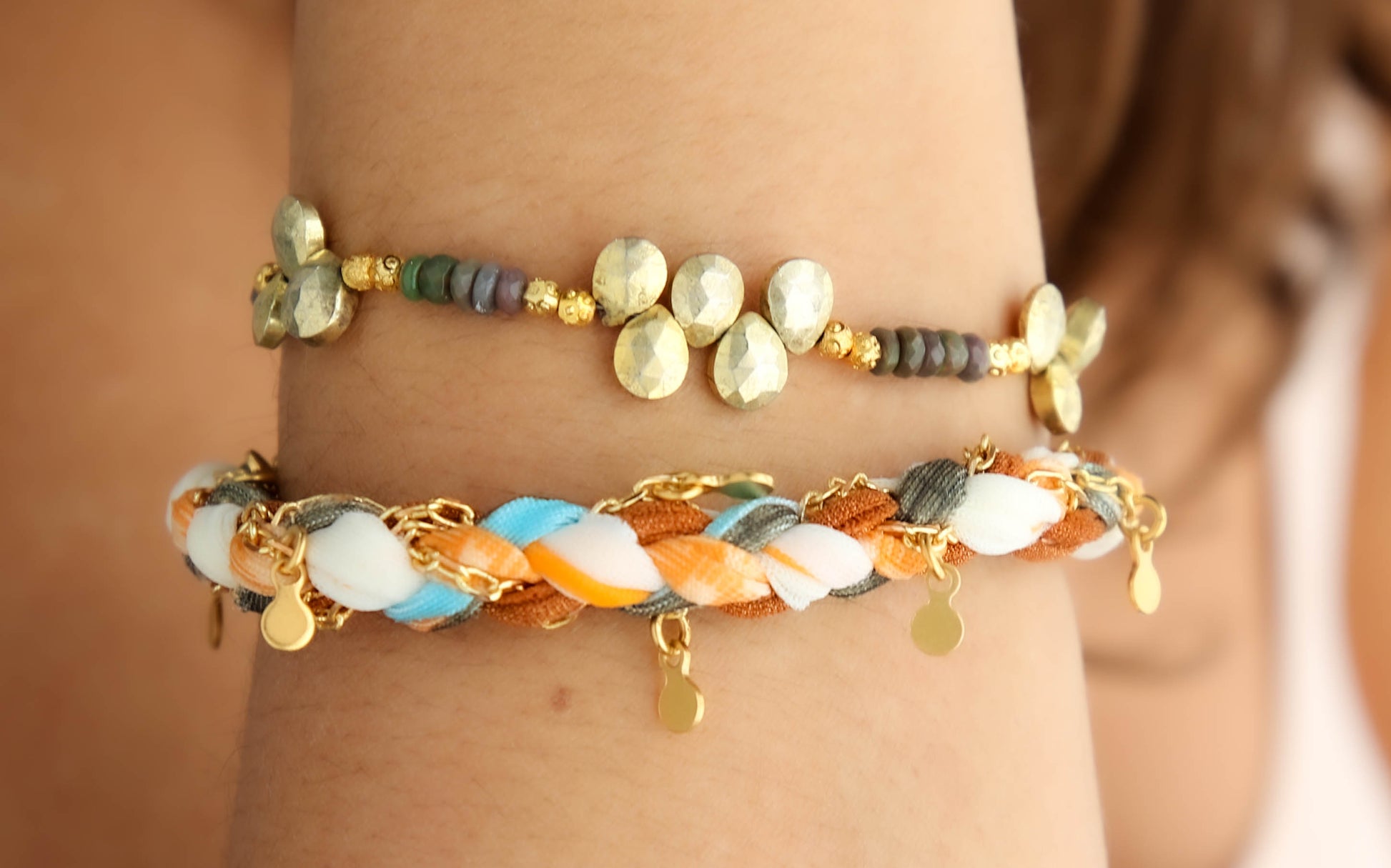 Hand-braided fabric strips in vibrant shades intertwine with delicate gold-dipped chains, creating a piece that’s as dynamic as you are. Gold charms shimmer playfully, while the adjustable clasp and soft construction ensure effortless comfort and elasticity. While the Confetti has not been part of our dance collection this bracelet indeed does dance with every move, turning everyday moments into personal festivities.