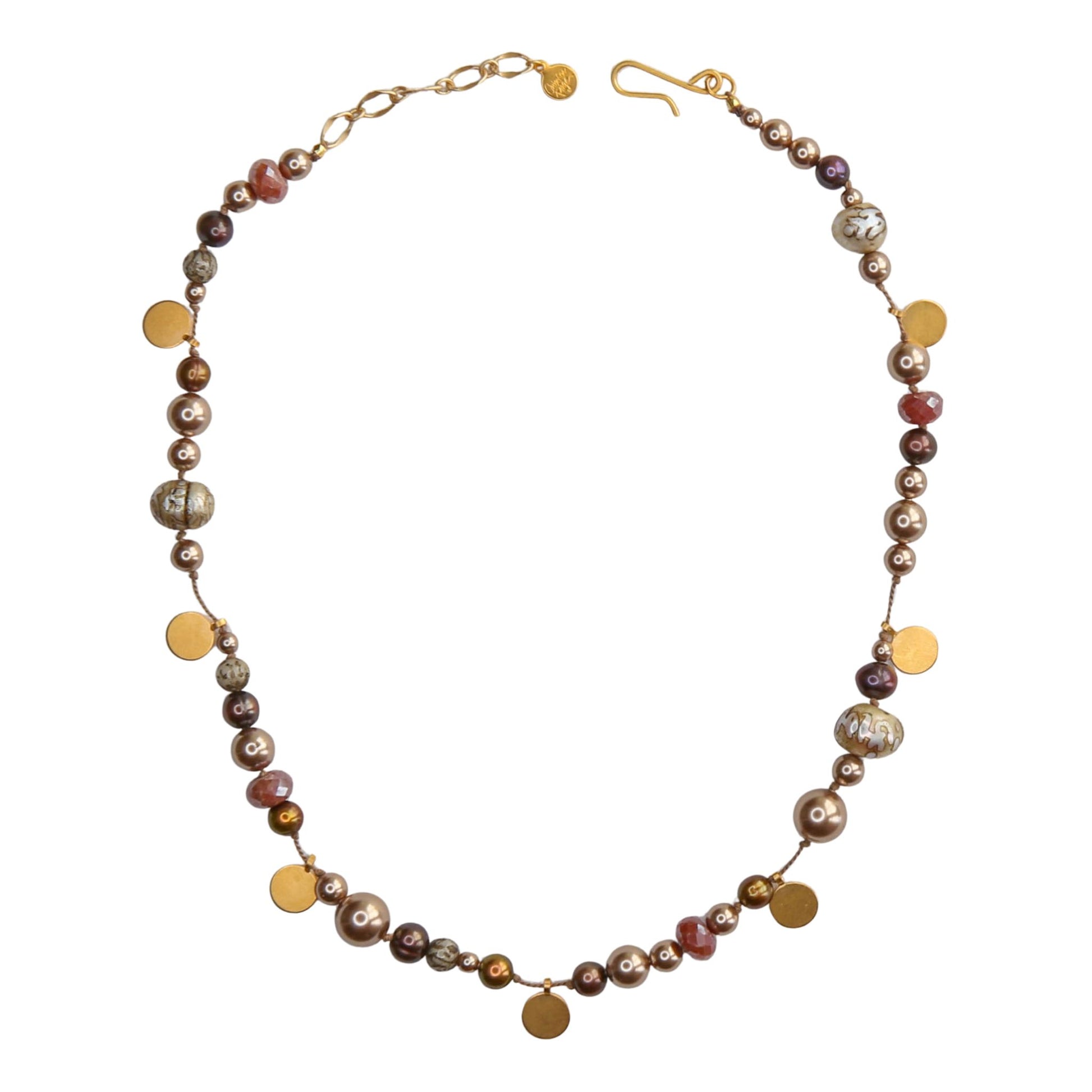 Our Evie hand-knotted strand of pearls and stones are spaced with soft flashes of metal and finished with subtle disc details that catch the light as you move. Nothing loud or bulky, just rhythm, balance, and an ease that feels lived-in from the first wear.