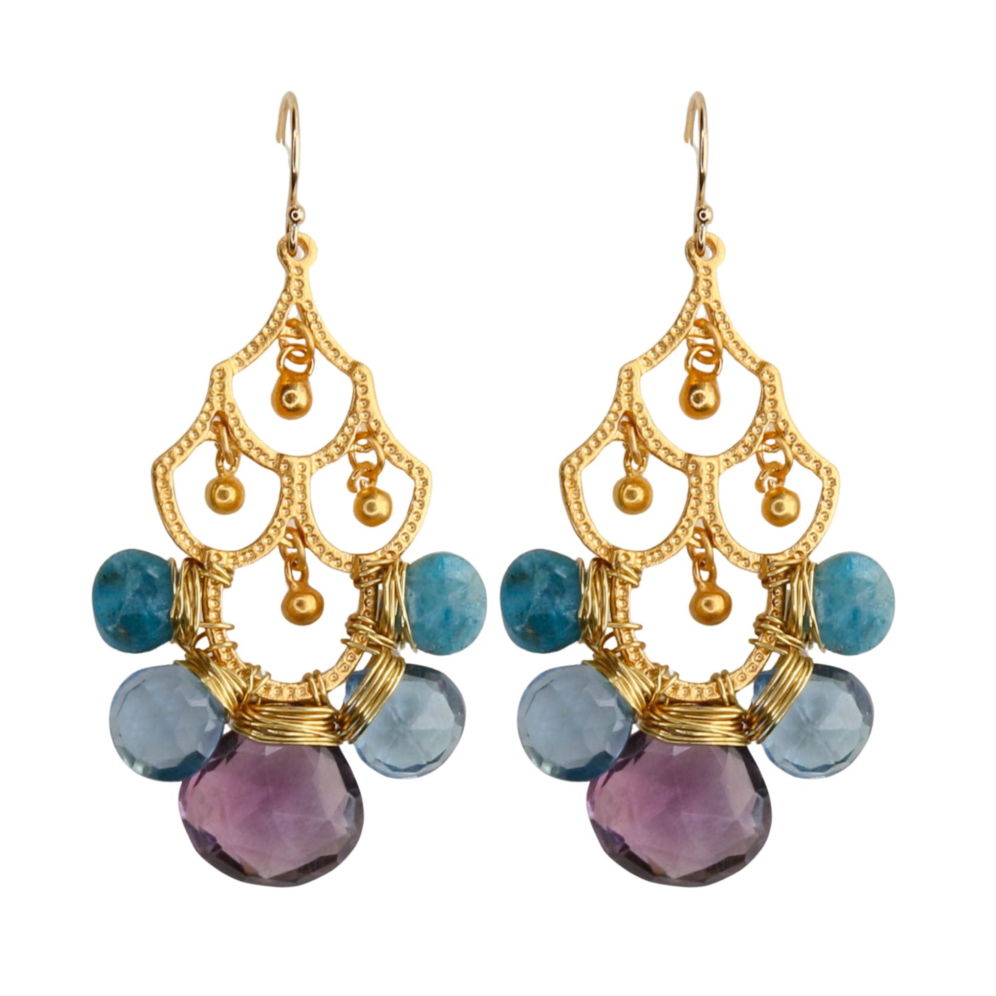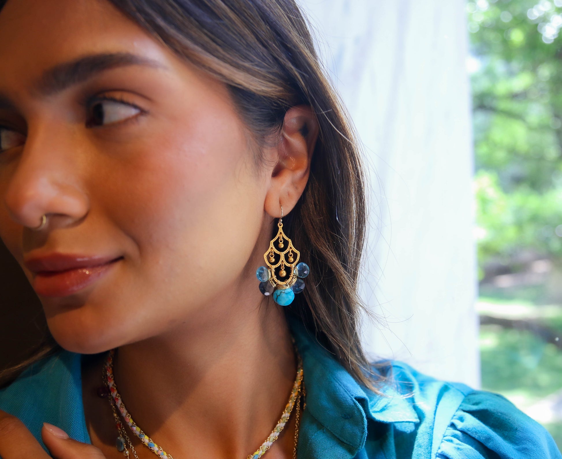 Our spring line was inspired and named by dances around the world. In the Frances earring gold dangles sway like dancers inside of our cast frame that's finished with hand wrapped semi precious stones. We find that our fans say our earrings are for those who like to spoil not only themselves, but those they love. Our earrings are truly a celebration of individuality, and for those who value thoughtful details and enjoy feeling put together for any outing, from lunch, to the nail salon, to carline and everything in between.