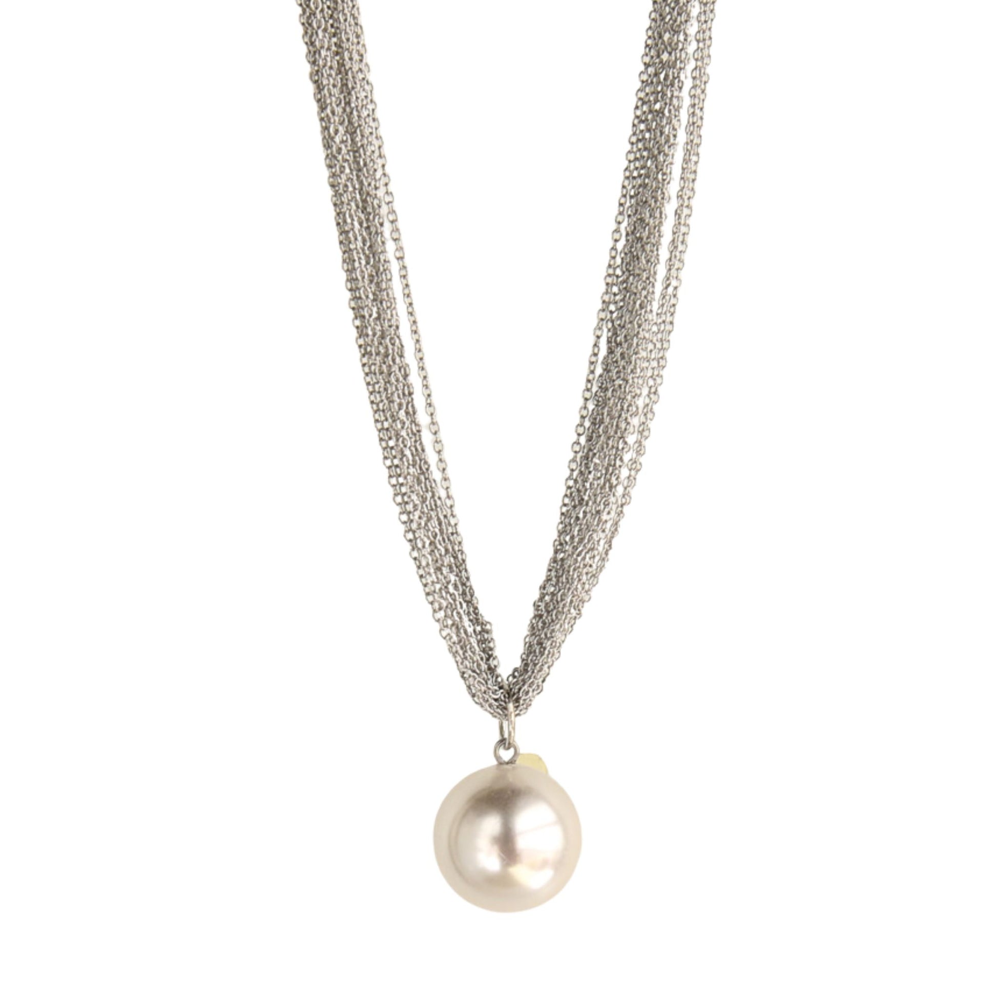 Hypo allergenic plated chain with large round pearl. Approximately 16" length. Women owned, sustainable, and always handmade.