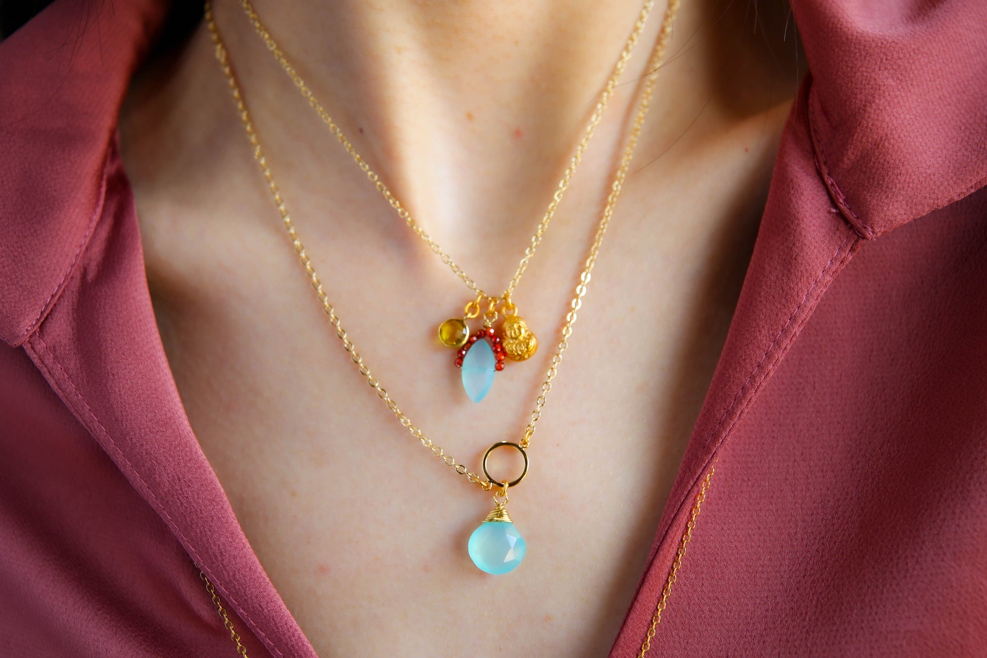 The Macaroon pairs the natural glow of aqua chalcedony with the subtle shimmer of plated chain. It's versatility and color options make it a brand best seller. The single stone adds a clean, modern touch, while the silicone spacer provides complete versatility. It’s a timeless piece that transitions seamlessly from casual to formal settings.