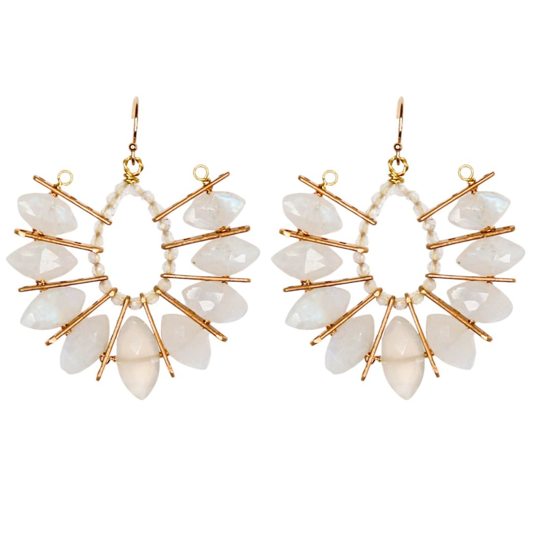 The Marquis Earring in Moonstone is designed for the woman who sees her earrings as an essential part of her self-expression. This collection is inspired by the exotic travel trends that are all the rage this season, offering pieces that transport you to distant, imagined places. The Marquis Earrings feature vivid, irregularly shaped stones that boldly feather out like wings—an eye-catching statement.