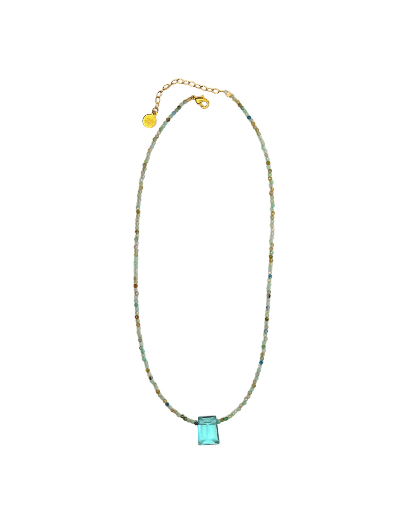 The Ocean Stone pairs the natural glow of aqua chalcedony with the subtle shimmer of faceted gemstones. It's versatility and color options make it a brand best seller. The rectangular pendant adds a clean, modern touch, while the delicate stones provide understated elegance. Adjustable for versatility, it’s a timeless piece that transitions seamlessly from casual to formal settings.