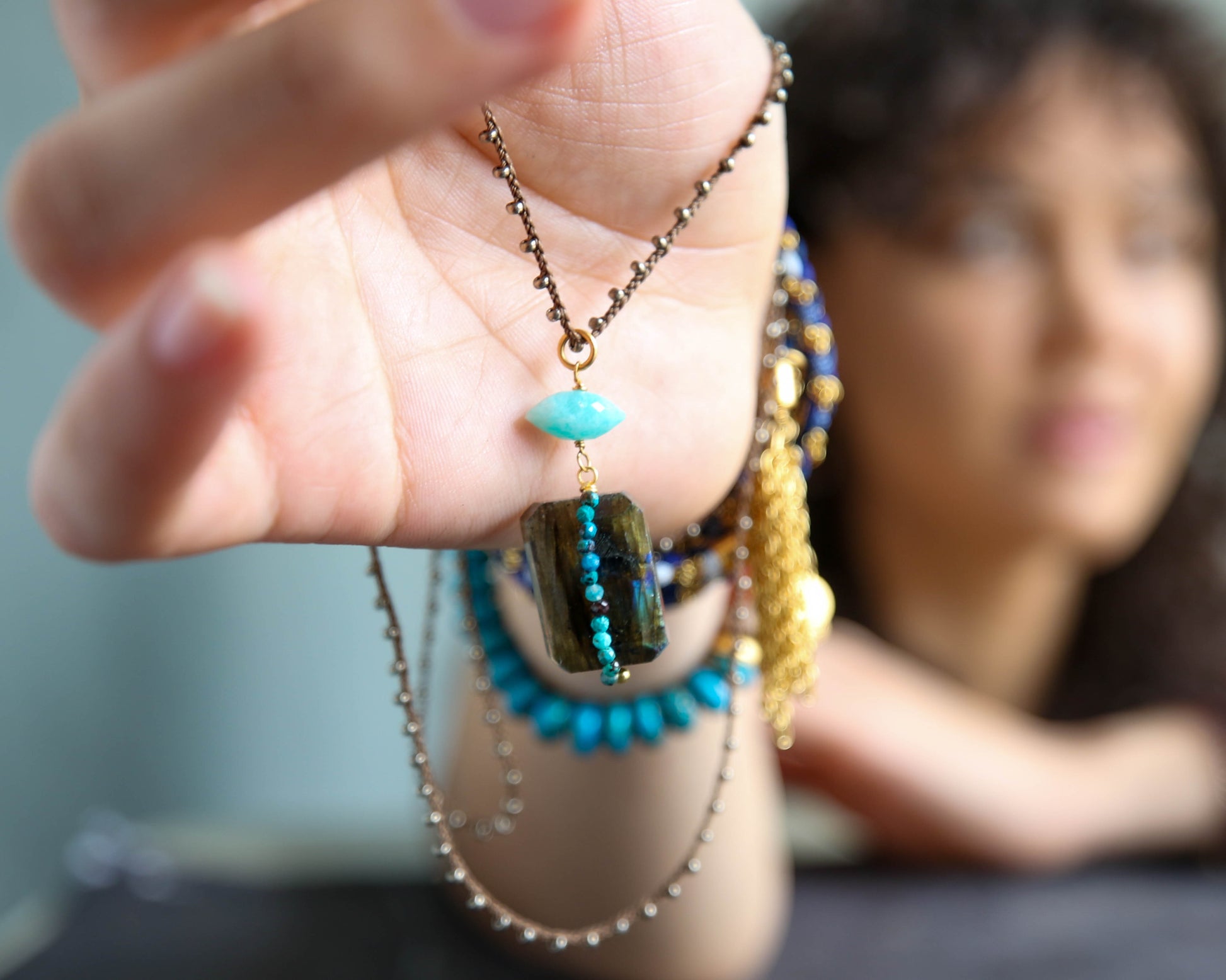 The Provo Necklace in Amazonite exudes effortless bohemian cool. Layered strands of delicate beading intertwine, creating a laid-back, free-spirited vibe. A striking, angular gemstone is paired with a pop of color and a cascade of smaller beads, adding an edgy yet relaxed focal point to the design. Perfect for layering or wearing solo, this necklace is the ideal statement piece for any modern boho style.