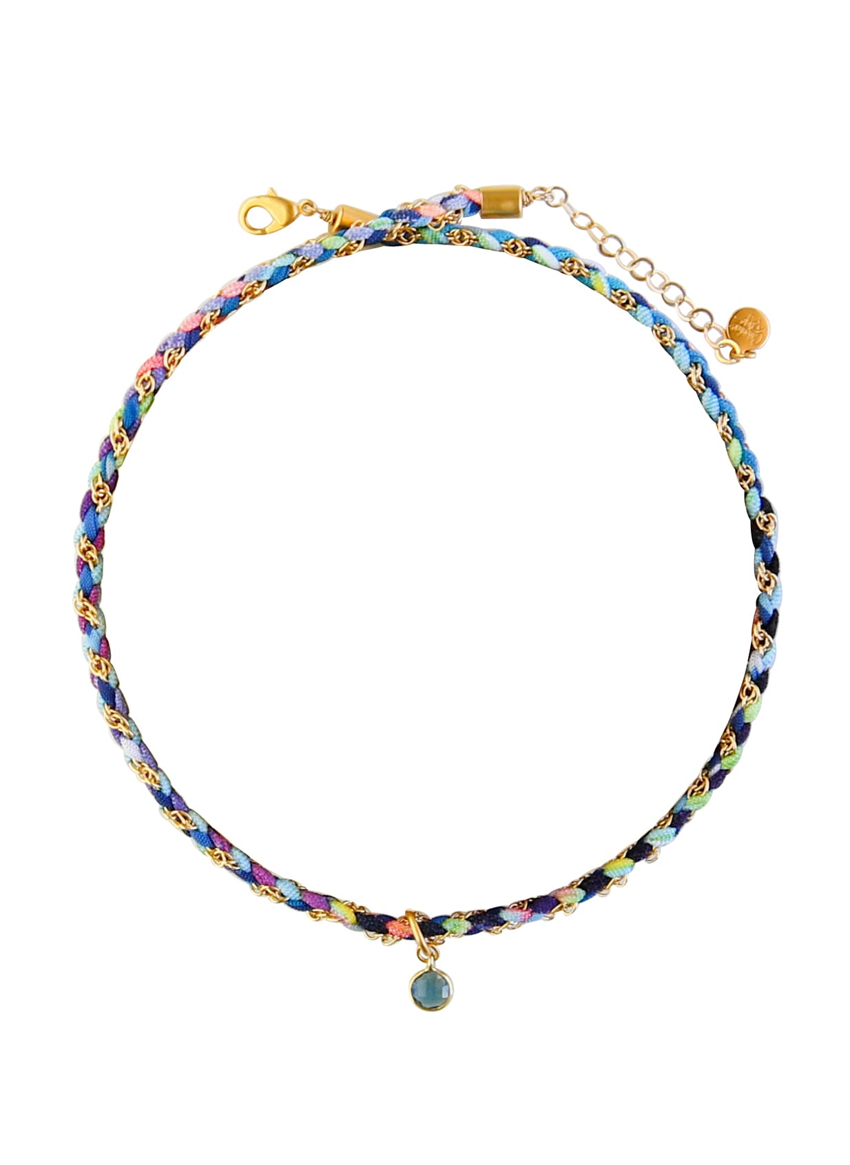 Hand-braided fabric strips in vibrant shades intertwine with plated rope chain, creating a piece that’s as dynamic as you are. A single bezel charm adorns the center, while the adjustable clasp and soft construction ensure effortless comfort and elasticity. While the Round About has not been part of our dance collection this choker indeed does dance with every move, turning everyday moments into personal festivities.