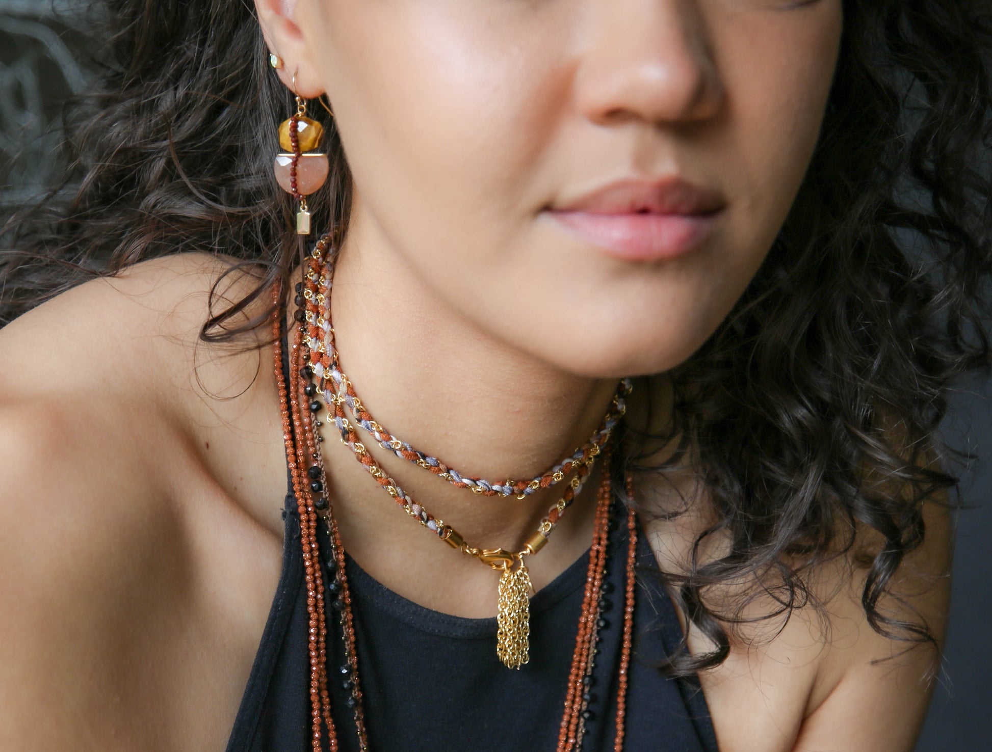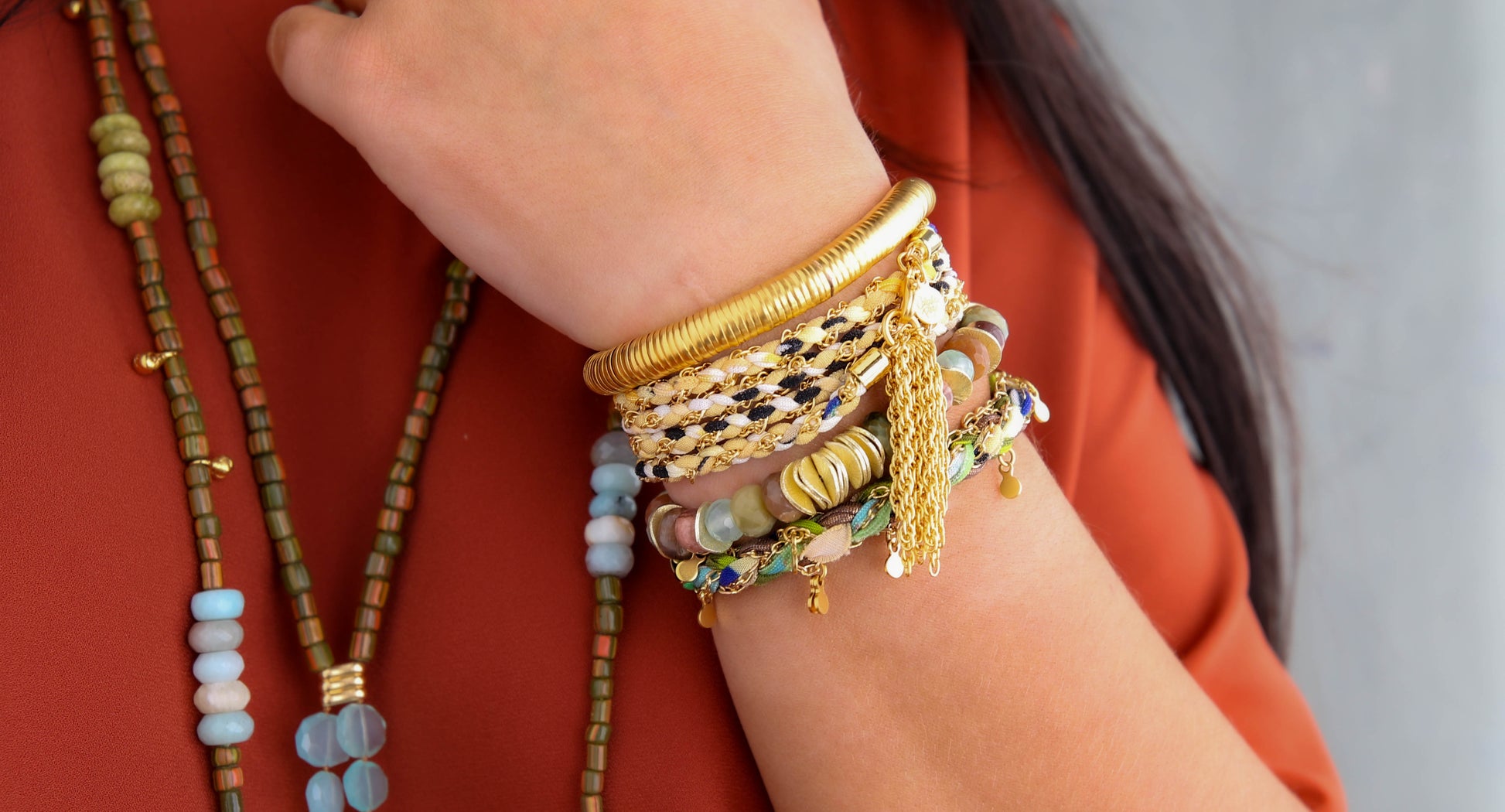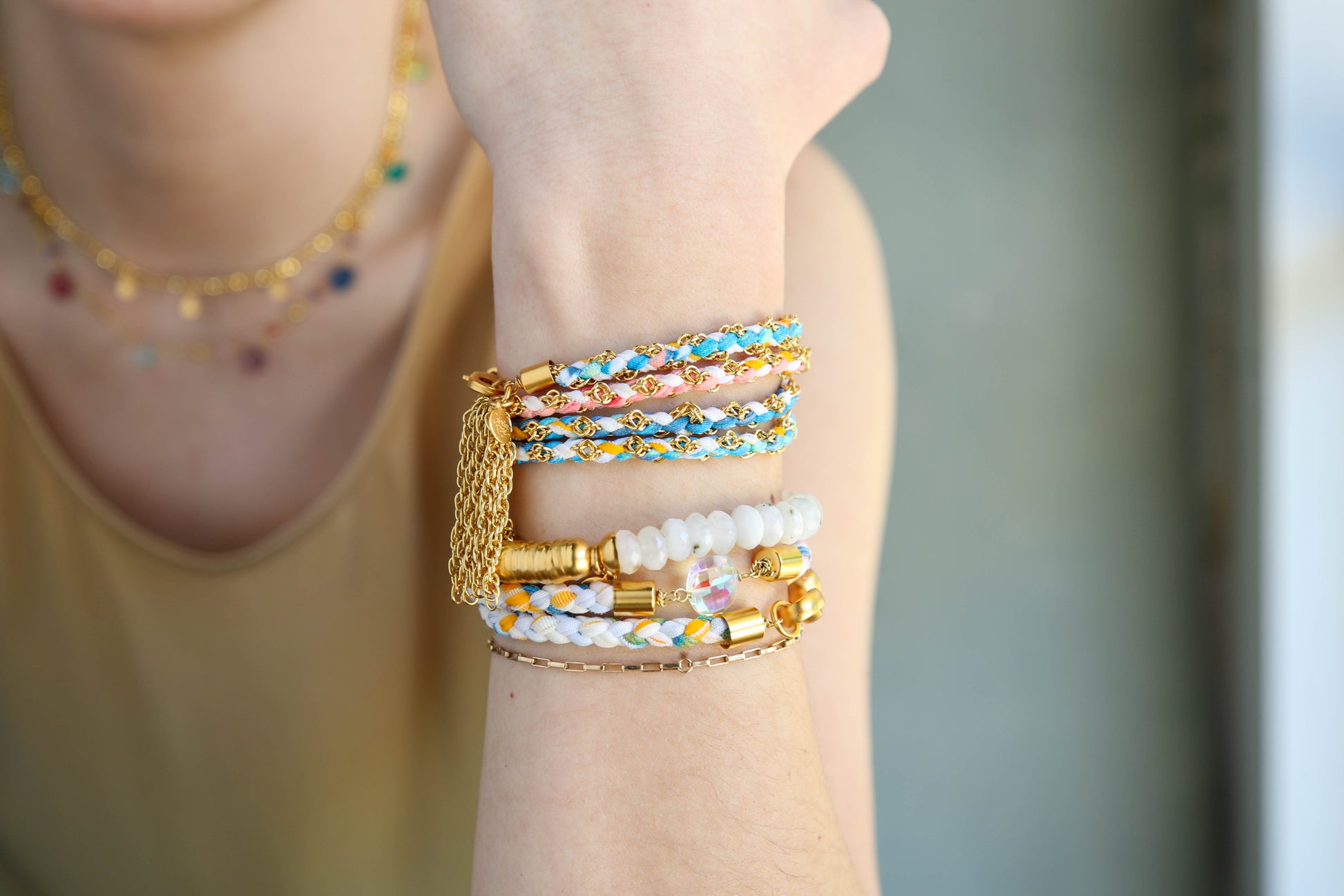 Hand-braided fabric strips in vibrant shades intertwine with plated rope chain, creating a piece that’s as dynamic as you are. The adjustable clasp and soft construction ensure effortless comfort and elasticity. While the Round About has not been part of our dance collection this piece indeed does dance with every move, turning everyday moments into personal festivities.