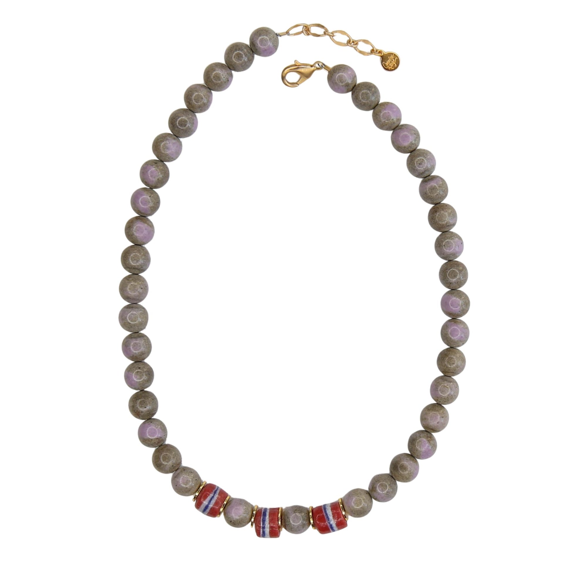 Bold yet balanced, the Sheba necklace is a staple piece with a playful edge. A dynamic mix of polished gemstones are arranged in a rhythmic pattern that feels collected, not curated. The center African beads ground the piece for a more organic feel. For the customer who loves personality, depth, and a fresh take on the season's trends.