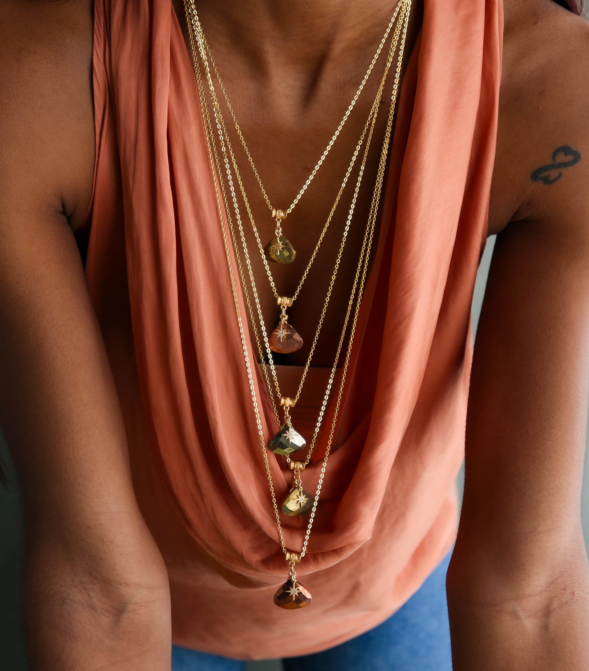 Jewelry should be as versatile as you are. The Simms Pendant features a striking green moonstone, paired with a delicate starburst charm for a touch of celestial detail. Designed with a silicone bead stopper, it offers complete adjustability—wear it high, low, or anywhere in between.
