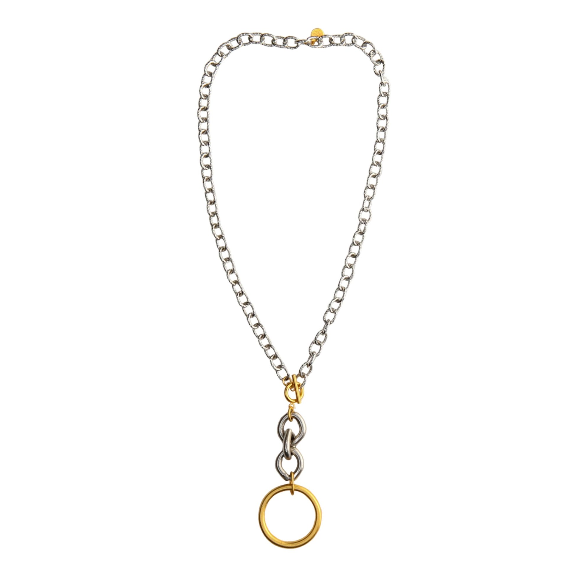 The Sloan Pendant Necklace is for the woman who views her jewelry as an essential part of her expression, not just an accessory. While so much of the line features color, this piece layers and anchors an outfit with mixed metals.