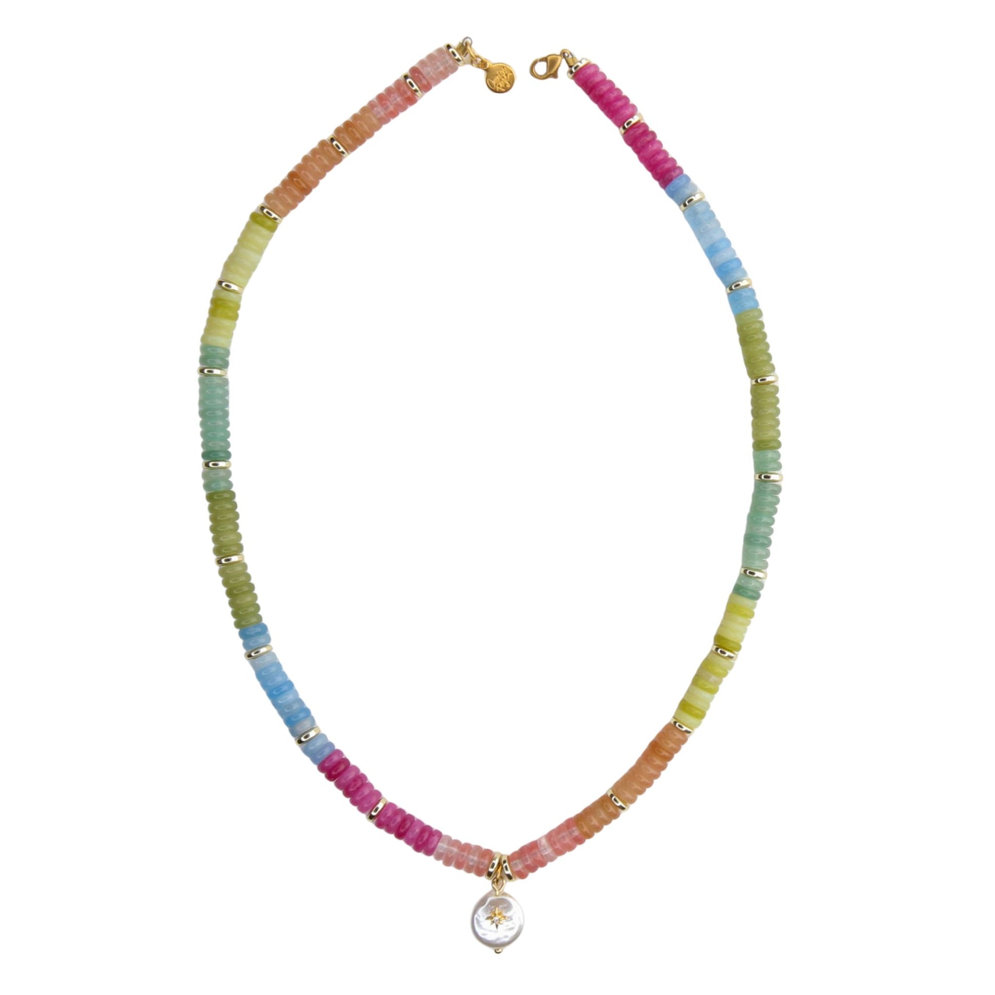 A strand of hand-cut gemstones move through gentle shifts of tone, punctuated by slim touches of gold and finished with a small luminous pearl charm that rests just where it should. The effect is fluid and grounded, not fussy.