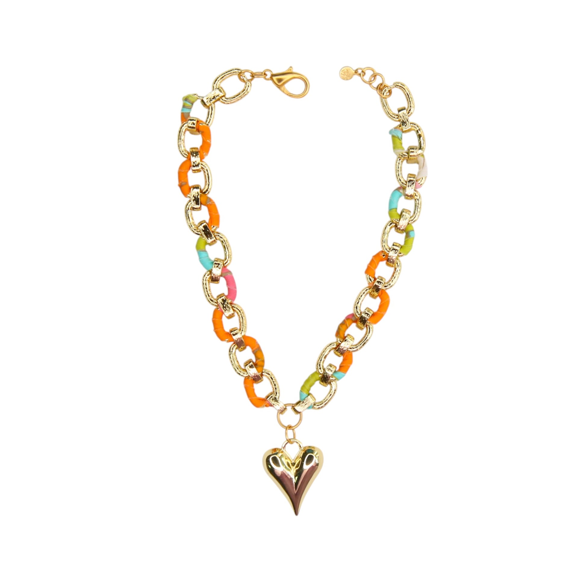 Chunky gold-plated links are paired with hand-wrapped fabric connectors in saturated hues—think deep red, vivid blue and hot pink. A sculptural heart pendant anchors the center, giving bold, playful energy without sacrificing sophistication. This piece is a standout on its own but layers easily with longer chains or casual textiles. It’s lightweight, adjustable, and guaranteed to spark conversation—whether she’s at brunch or on the go.
